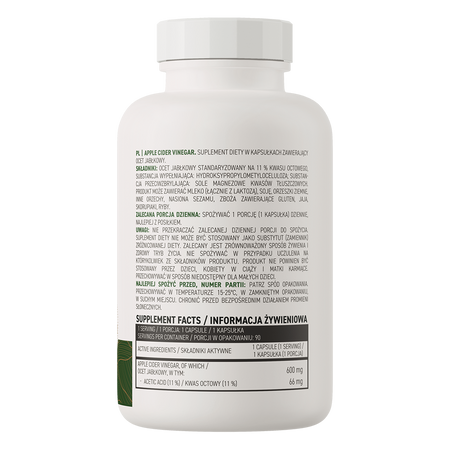 OstroVit Apple Cider Vinegar is a high-quality dietary supplement that is a source of apple cider vinegar standardized to 11% acetic acid. It is a vegan preparation available in the form of easy-to-swallow capsules, created for people who care about a healthy and beautiful appearance, as well as to supplement the daily diet with a valuable compound.