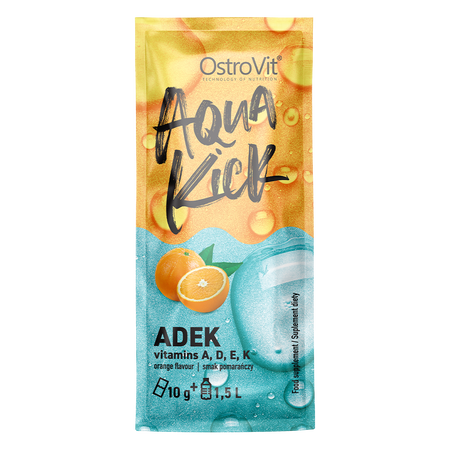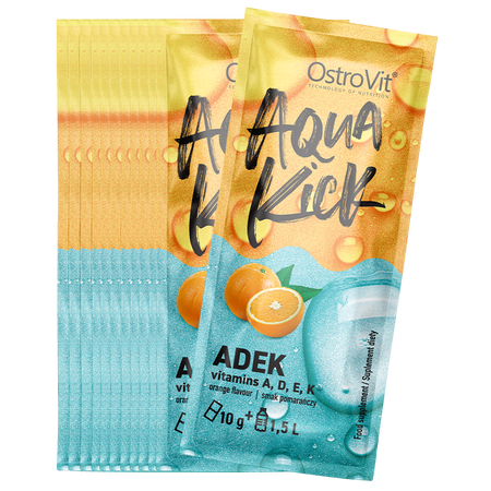 OstroVit Aqua Kick ADEK is a dietary supplement that is a source of fat-soluble vitamins such as vitamin A, vitamin D and vitamins E and K. It is a modern preparation with a unique, orange taste, which is available in convenient sachet form. It is a product created for physically active people, which enables a trouble-free supply of valuable micronutrients.