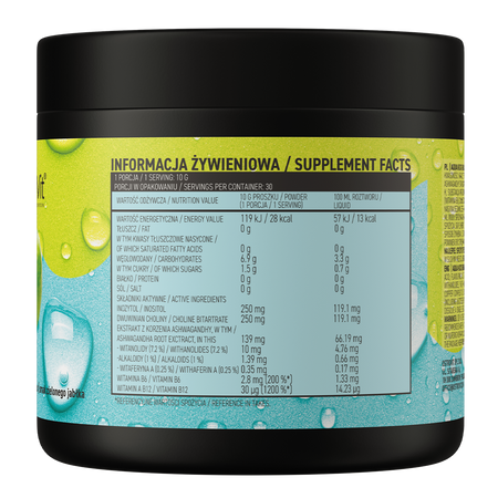 - Source of valuable compounds - one serving of the dietary supplement provides the body with 250 mg of inositol, 250 mg of choline bitartrate, as well as ashwagandha root extract standardized to 7,2% withanolides, 1% alkaloids and 0,25% withaferin A, as well as 2,8 mg of vitamin B6 and 30 μg of vitamin B12.