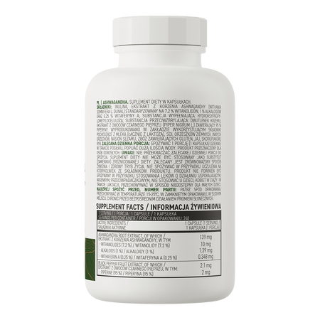 - Source of valuable compounds - one serving of the dietary supplement provides the body with 139 mg of ashwagandha root extract standardized to 7,2% withanolides, 1% alkaloids and 0,25% vitamin A, as well as 2,1 mg of black pepper fruit extract standardized to 95% piperine.