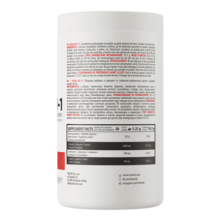 OstroVit BCAA 20-1-1 is a high-quality dietary supplement that is a source of branched chain amino acids - L-leucine, L-isoleucine and L-valine. It is a preparation with a delicious flavour of creamy strawberry, available in a convenient to use powder form, which does not contain added sugar. It is a product designed for athletes and physically active people who want to supplement the diet with valuable amino acids.