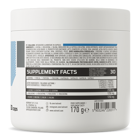 OstroVit BCAA 5000 mg is a high-quality dietary supplement that is a source of branched chain amino acids. It is a preparation with a simple composition, available in the form of easy-to-swallow capsules. It is a product designed for athletes and physically active people who want to supplement the diet with valuable amino acids.