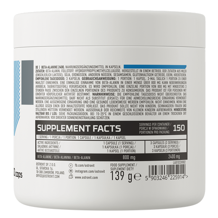 OstroVit Beta-Alanine 2400 mg is a high-quality dietary supplement that is a source of beta-alanine. It is a preparation available in the form of easy-to-swallow capsules, designed for athletes and physically active people who want to supplement the diet with a valuable ingredient.