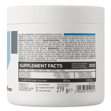 OstroVit Beta-Alanine 2400 mg is a high-quality dietary supplement that is a source of beta-alanine. It is a preparation available in the form of easy-to-swallow capsules, designed for athletes and physically active people who want to supplement the diet with a valuable ingredient.