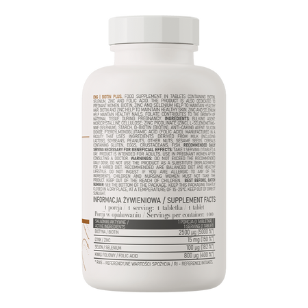OstroVit Biotin Plus is a comprehensive dietary supplement that is a source of valuable substances - biotin, zinc, selenium and folic acid. It is a preparation available in a convenient form of tablets, designed for people who want to supplement their daily diet with valuable ingredients and on a healthy and beautiful appearance.