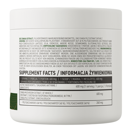 - One serving of the dietary supplement provides the body with 600 mg of chaga extract standardized to 40% polysaccharides.