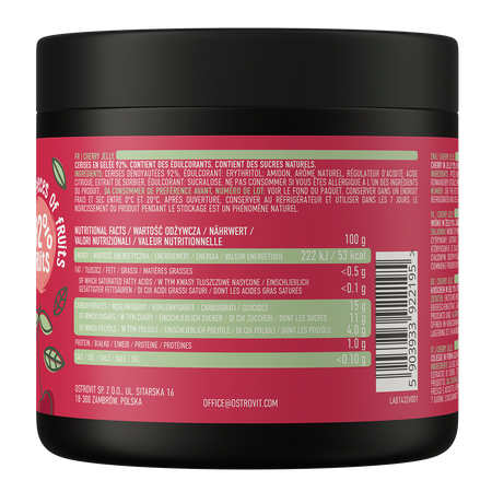 OstroVit Cherry in Jelly 500 g is a fruit in jelly with the taste of juicy cherries without added sugar! The product is a perfect complement to desserts, pancakes and dietary snacks for all those who care about the low glycemic index in their daily diet. If you care about the value of your meals - try a healthier alternative to high-calorie jams in the form of OstroVit fruits in jelly without added sugar. Choose your favourite flavour and enjoy it without remorse!