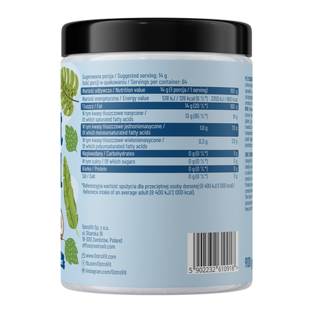 OstroVit Coconut Oil is a 100% natural product that has been refined, contains no added salt or sugar and is free of all impurities. This preparation is recommended especially for conscious consumers and physically active people.