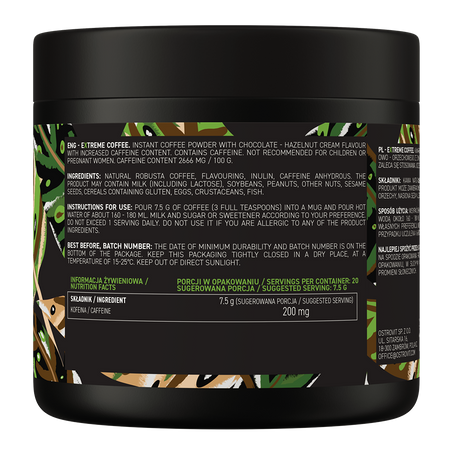 Instant coffee powder with chocolate - hazelnut cream flavour with increased caffeine content.. Contains caffeine. Not recommended for children or pregnant women. Caffeine content 2666 mg/100 g.