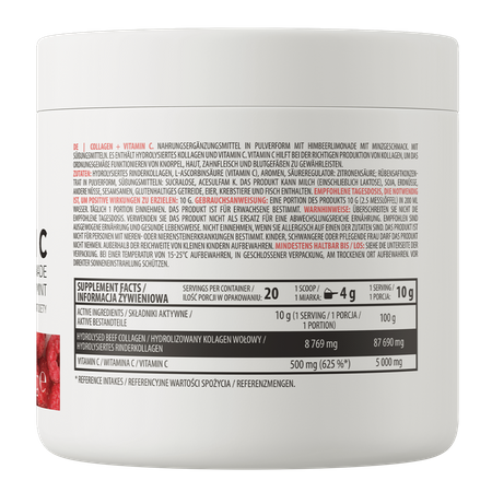 OstroVit Collagen + Vitamin C is a high-quality dietary supplement, which is a source of hydrolyzed beef collagen and valuable L-ascorbic acid. It is a preparation in the form of powder, available in various flavors, which is perfect as a supplement to the daily diet among physically active people and those who care about a healthy and beautiful appearance.