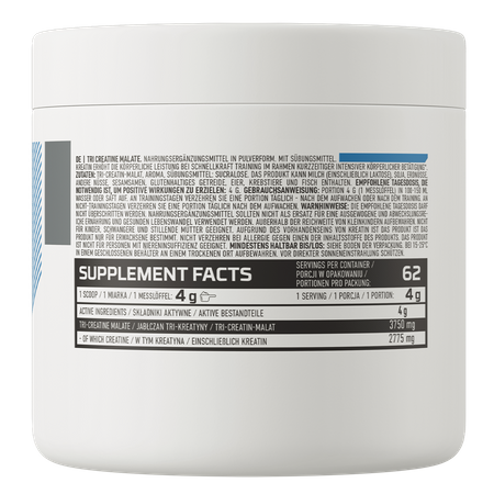 OstroVit uses creatine malate, i.e. combination of creatine molecule with malic acid in a 1:3 ratio. It is one of the most soluble forms of the compound, which is distinguished by high stability and resistance to gastric enzymes, as well as excellent assimilability in the human body. Creatine malate contributes to water retention in the body to a much lesser extent than monohydrate, which makes it very popular among athletes of various disciplines.