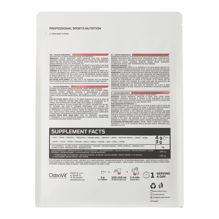 OstroVit uses creatine monohydrate, i.e. a combination of a creatine molecule with a water molecule into one molecule - because creatine is a hydrophilic compound, it combines with water without any problems and thus is a substance that is distinguished by excellent assimilability. Creatine monohydrate is the simplest form of creatine in terms of structure and at the same time the compound that is the most popular among athletes - it is perfect for both beginners and professionals, which is due to the fact that creatine increases physical performance in the case of successive, short, very intense physical exercises and beneficial effect occurs when consuming 3 g of creatine per day.