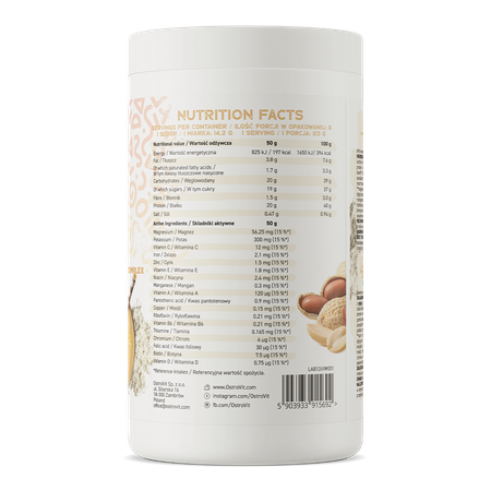 OstroVit Delicious Shake Vitamin is a high-protein shake blend that contains a complex of vitamins and minerals. This preparation is available in the form of a powder with a delicious peanut flavor. It is a product created for athletes and people who want to supplement their daily diet with valuable ingredients.