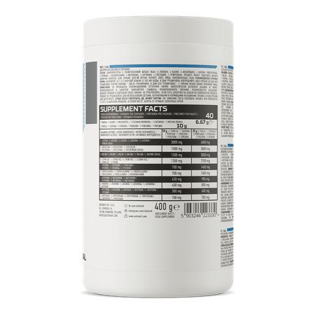 - The source of essential exogenous amino acids - One serving of the dietary supplement provides the body with 3000 mg L of leucine, 1500 mg of L of isoleucine, 1500 mg of L of valine and 1350 mg of L of lysine HCl, 700 mg of L of threonine, 700 mg of L of phenylalanine, as well as 450 mg of L of methionine and 400 mg of L of arginine. Product also contains 300 mg of L-histidine and 100 mg of L-tryptophan.
