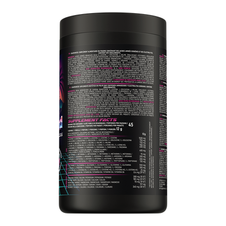 BCAA branched-chain amino acids (L-leucine, L-valine, L-isoleucine, emulsifier: lecithins), acidity regulator: citric acid; potassium citrate (potassium), L-lysine hydrochloride, flavourings, L-glutamine, calcium carbonate (calcium), magnesium salts of citric acid (magnesium), L-threonine, L-phenylalanine, sodium chloride (sodium, chloride), L-tyrosine, bulking agent: isomalt; L-arginine, L-histidine, beet juice concentrate in powder, L-tryptophan, L-methionine, L-cysteine hydrochloride, sweeteners: sucralose, acesulfame K; pyridoxine hydrochloride (vitamin B6).
