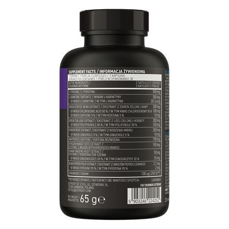 - Source of ten valuable ingredients - one serving of the dietary supplement provides the body with 500 mg of L-tyrosine, 300 mg of L-carnitine tartrate, 200 mg of green coffee bean extract standardized to 50% chlorogenic acid and 5% caffeine, as well as 200 mg of green tea leaf extract standardized to 50% polyphenols and 200 mg of ginger root extract standardized to 5% gingerols. The product also contains 190 mg of caffeine anhydrous, 150 mg of African mango seed extract and 50 mg of ginseng root extract standardized to 20% ginsenosides, 2,1 mg of black pepper fruit extract standardized to 95% piperine and 100 μg of chromium.