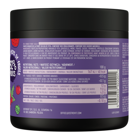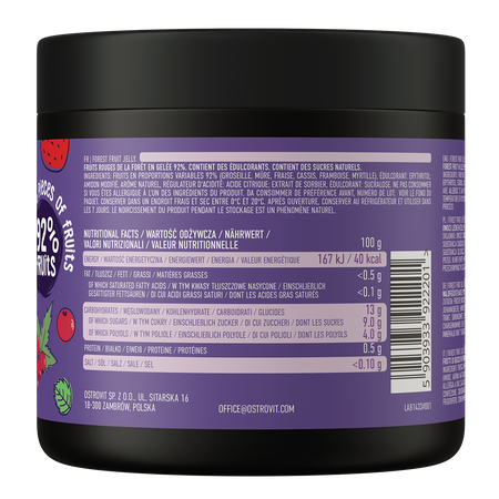 - MINIMUM AMOUNT OF CALORIES - 100 g of our OstroVit Forest Fruit Jelly is about 40 kcal - much less than 100 g of standard jam or fruit marmalade. You can enjoy its taste without remorse - it is suitable for people who care about reduced calorie dishes.