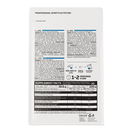 OstroVit uses maltodextrin, a compound obtained by enzymatic hydrolysis of starch, which is easily digestible and is quickly absorbed in the human body, as well as whey protein concentrate - animal source of protein, which is distinguished by good solubility, excellent assimilability and short absorption time, which has a positive effect on the quality and effectiveness of supplementation.
