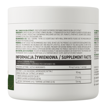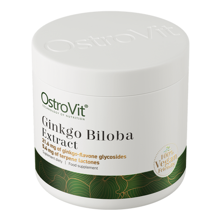 OstroVit Ginkgo Biloba Extract is a dietary supplement that contains ginkgo biloba leaf extract standardized to 24% ginkoflavonoglycosides and 6% terpene lactones. It is a high-quality preparation available in a convenient powder form, created for conscious consumers who want to supplement their diet with valuable substances.