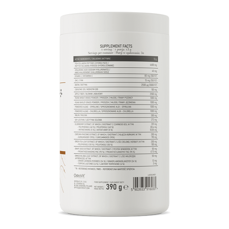 Fish collagen peptides (hydrolyzed), błonnik jabłkowy, powdered young barley grass, powdered young wheat grass, powdered algae - spirulina (Spirulina platensis (Gomont) Geitler), powdered algae - chlorella (Chlorella pyrenoidosa), chicory inulin (prebiotic), soy lecithin, black elderberry extract (Sambucus nigra L.) - 40% polyphenols and 5% anthocyanins, green tea leaf extract (Camellia sinensis L.) - 50% polyphenols, turmeric rhizome extract (Curcuma longa L.) - 95% curcuminoids, ubiquinone (coenzyme Q10), L-ascorbic acid (vitamin C), anti-caking agent: silicon dioxide; acidity regulator: citric acid; zinc picolinate (zinc), grape seed extract (Vitis vinifera L.) - 95% proanthocyanidins (PAC), ginkgo biloba leaf extract (Ginkgo biloba L.) - 24% gincoflavonoglycosides and 6% terpene lactones, aromas, hyaluronic acid (sodium hyaluronate), sweeteners: sucralose, acesulfame K; dye: carotenes; D-biotin (biotin).