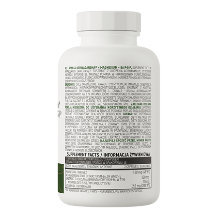 - Source of valuable substances - one serving of the dietary supplement provides the body with 180 mg of magnesium, 200 mg of ashwagandha root extract KSM-66 standardized to 5% withanolides and 2,8 mg of vitamin B6 P-5-P.