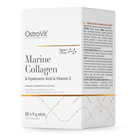 Collagen is one of the main building proteins of the body, which is a natural polymer and an important component of the intercellular substance of animal organisms. Since the level of collagen in the body decreases with age as a result of natural aging processes, it is worth supplying the compound to the body also from the outside - collagen occurs, among others, in bones or animal tendons, and is also available in the form of dietary supplements. Used in OstroVit Marine Collagen + Hyaluronic Acid + Vitamin C Box marine collagen is a source of hydrolyzed fish collagen peptides, whose structure resembles human collagen. This, however, makes the substance perfectly absorbed in the human body.