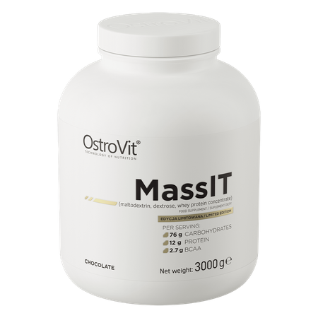 OstroVit Mass IT is a high-quality dietary supplement that provides a source of carbohydrates and protein. It is a nutrient available in a convenient powder form, with a delicious, melt-in-your-mouth chocolate taste. It is a product created for athletes and physically active people who want to supplement their diet with valuable macronutrients.