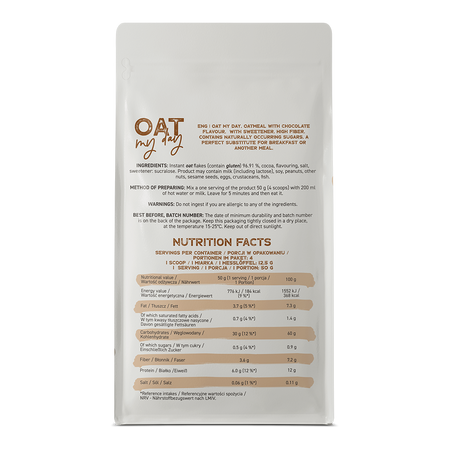 OstroVit Oat My Day is a nutritious porridge that stands out for its richness in dietary fiber. The product does not contain added sugar, and the sweet taste is due to pieces of natural, freeze-dried fruit and a low-energy sweetener, which is sucralose. Available in four different flavor variants, the mix is a solution that will satisfy the appetite and individual preferences of the consumer, while the simplicity and short time needed to prepare the meal will allow you to enjoy a tasty and healthy snack even during a busy day.