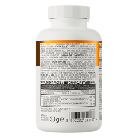 OstroVit Omega 3 is a high-quality dietary supplement based on fish oil, which is a source of omega-3 polyunsaturated fatty acids. The preparation contains valuable compounds such as eicosapentaenoic acid (EPA) and docosahexaenoic acid (DHA) and is available in the form of easy-to-swallow, sofgel capsules.