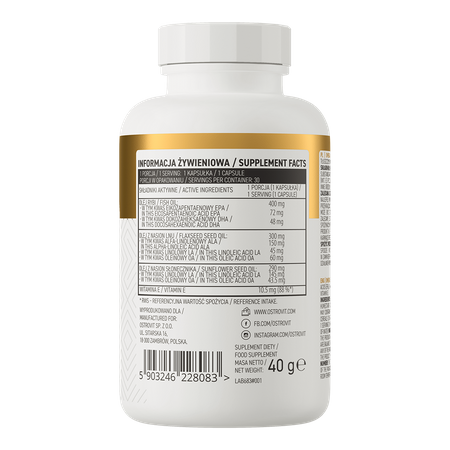 Omega 3 fatty acids are essential fatty acids that are not synthesized in the human body, so they must be supplied to the body with the daily diet or, if necessary, in the form of supplements. OstroVit uses alpha-linolenic acid (ALA), which can be found primarily in linseed oil, as well as eicosapentaenoic acid (EPA) and docosahexaenoic acid (DHA), i.e. compounds whose source is mainly oily sea fish.