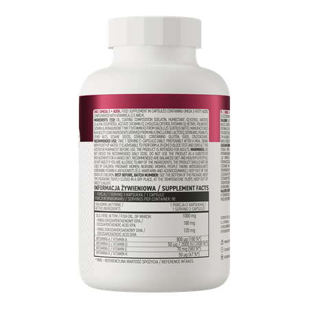 OstroVit Omega 3 + ADEK is a high-quality dietary supplement that contains omega-3 polyunsaturated fatty acids, such as eicosapentaenoic acid (EPA) and docosahexaenoic acid (DHA), and at the same time provides the body with valuable fat-soluble vitamins - vitamin A, D, as well as vitamin E and K. It is a complex preparation, available in the form of easy-to-swallow capsules, which is a valuable addition to the diet.