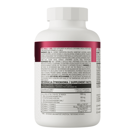 OstroVit Omega 3 + ADEK is a high-quality dietary supplement that contains omega-3 polyunsaturated fatty acids, such as eicosapentaenoic acid (EPA) and docosahexaenoic acid (DHA), and at the same time provides the body with valuable fat-soluble vitamins - vitamin A, D, as well as vitamin E and K. It is a complex preparation, available in the form of easy-to-swallow capsules, which is a valuable addition to the diet.