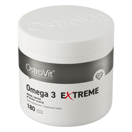 OstroVit Omega 3 Extreme 180 capsules is a dietary supplement that provides the body with as much as 1000 mg of fish oil in a single serving of the product. At the same time, the preparation is a source of significant amounts of valuable unsaturated fatty acids, such as eicosapentaenoic acid (EPA) and docosahexaenoic acid (DHA). OstroVit Omega 3 Extreme 180 capsules is a product available in the form of easy-to-swallow softgel capsules, which lasts for as much as six months of regular supplementation.