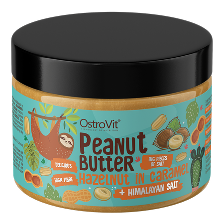 OstroVit Peanut Butter + Hazelnut in Caramel + Himalayan Salt is a delicious nut cream consisting of simple and surprising ingredients. The product is based on two kinds of nuts: peanuts and caramelized hazelnuts, and a Himalayan salt. Are you looking for a reliable sweat cream which can be added to sandwiches, pancakes, porridge, pies, ice-cream or other desserts? You have to try OstroVit Peanut Butter + Hazelnut in Caramel + Himalayan Salt!