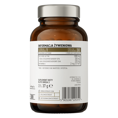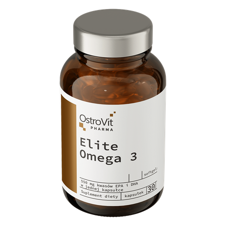 OstroVit Pharma Elite Omega 3 is a high-quality dietary supplement based on fish oil, which is a source of polyunsaturated omega-3 fatty acids. The preparation contains valuable compounds such as eicosapentaenoic acid (EPA) and docosahexaenoic acid (DHA), as well as vitamin E. It is a product from the elite Pharma Elite line, created for conscious consumers, which is available in the form of softgel capsules.