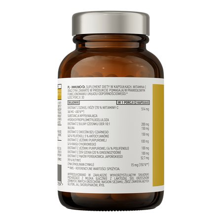 Rosehip extract (70% vitamin C 360 mg - 450%*), inulin, garlic bulb extract DER 10:1, elderberry fruit extract (40% polyphenols, 5% anthocyanins), purple echinacea extract ( 4% chicory acid), purple echinacea extract (4% polyphenols), ginseng extract (20% ginsenosides), Japanese pearl extract (95% rutin), zinc (zinc picolinate), capsule shell (filler: hydroxypropyl methylcellulose).