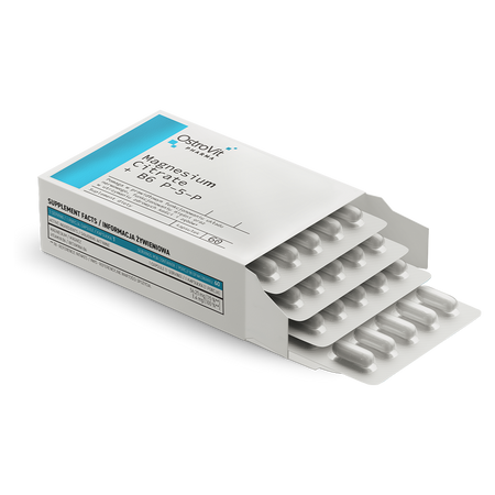 OstroVit Pharma Magnesium Citrate + B6 P-5-P is a high-quality dietary supplement that is a source of two valuable substances - magnesium and vitamin B6. It is a preparation from the elite line of OstroVit Pharma, available in the form of easy-to-swallow capsules. It is a product created for conscious consumers who want to supplement their daily diet with valuable micronutrients.