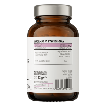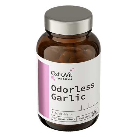OstroVit Pharma Odorless Garlic is a high-quality dietary supplement from the elite OstroVit Pharma line, which is a source of odorless oil from fresh garlic tubers. It is a preparation available in the form of easy-to-swallow capsules, created for people who want to supplement their daily diet with natural ingredients.