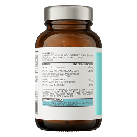 OstroVit Pharma Perspicare is a comprehensive dietary supplement that contains four different plant extracts - extract of sage leaves, above-ground parts of horsetail, as well as extract of nettle leaves and lemon balm leaves. This is a product from OstroVit Pharma's elite line, available in easy-to-swallow capsules, designed for conscious consumers who struggle with excessive sweating.