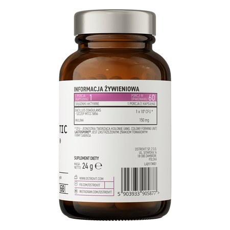 OstroVit Pharma PRO-60 BIOTIC LactoSpore® is a high quality dietary supplement that provides a source of live bacterial cultures Bacillus coagulans MTCC 5856 LactoSpore. The product also contains natural inulin derived from chicory. This is a preparation from OstroVit Pharma's elite line, available in the form of easy to swallow capsules, created for conscious consumers who care about supplementing their diet with valuable compounds.