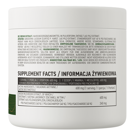 - One serving of the dietary supplement provides the body with 600 mg of the extract of the reishi mushroom standardized to 40% polysaccharides.
