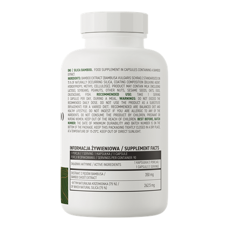 OstroVit Silica Bamboo VEGE extract is a high-quality dietary supplement that contains bamboo extract standardized to 75% naturally occurring silica. It is a vegan preparation, available in the form of easy-to-swallow capsules. It is a product created for people who want to supplement their daily diet with a valuable compound.