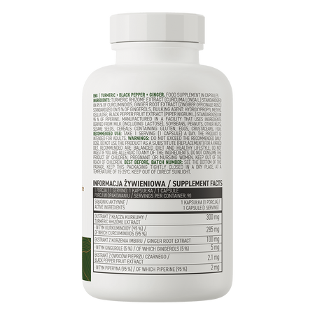 - Source of plant extracts - One serving of the dietary supplement provides the body with 300 mg of turmeric rhizome extract standardized to 95% curcuminoids, 100 mg of ginger root extract standardized to 5% gingerols and 2.1 mg of black pepper fruit extract standardized to 95% piperine.