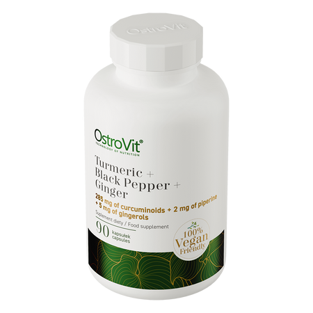 OstroVit Curcumin + Black Pepper + Ginger VEGE is a dietary supplement that is a source of three plant extracts. It is a preparation available in the form of easy-to-swallow capsules, created for people who want to supplement their daily diet with valuable compounds.