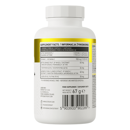 - Source of three valuable compounds - One serving of the dietary supplement provides the body with 900 mg of vitamin C, as well as 60 mg of bitter orange fruit extract standardized to 60% hesperidin and 40 mg of Japanese pearl flower extract standardized to 95% rutin.
