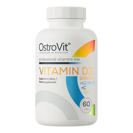 OstroVit Vitamin D3 2000 IU + K2 MK-7 + C + Zn is a complex dietary supplement that is a source of valuable ingredients - vitamin D3, vitamin K2, as well as vitamin C and zinc. It is a preparation available in the form of easy-to-swallow capsules, which has been created for people who want to supplement their daily diet with valuable compounds.
