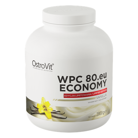 OstroVit WPC80.eu ECONOMY is a high-quality dietary supplement that contains WPC whey protein concentrate, thus providing a valuable source of protein. It is a preparation available in the powder form with a delicious, vanilla flavour, which was designed for athletes and people who are distinguished by increased demand for protein.