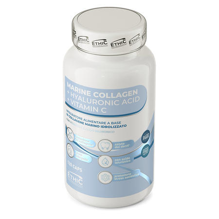 Ethic Nutraceutici Marine Collagene + Hyaluronic Acid + Vitamina C to suplement diety zawierający kompleks trzech starannie dobranych składników: hydrolizowanych peptydów kolagenu rybiego, kwasu hialuronowego w formie hialuronianu sodu oraz witaminy C. Preparat został opracowany z myślą o osobach, które chcą uzupełnić swoją codzienną dietę w cenne związki.