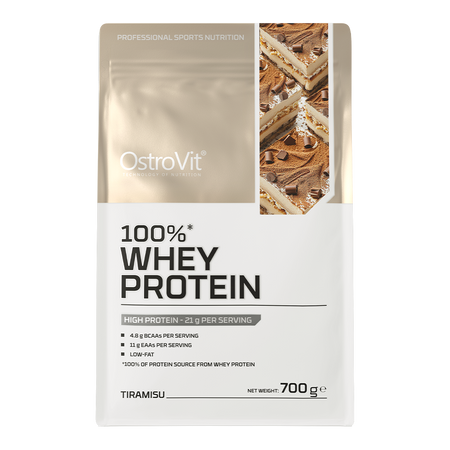 OstroVit 100% Whey Protein to suplement diety, który stanowi źródło koncentratu białka serwatki, zawierającego aż 70% wysokiej jakości protein. To preparat, który dostarcza do organizmu aminokwasy rozgałęzione BCAA, a także niezbędne aminokwasy egzogenne EAA. To niskotłuszczowy produkt, dostępny w postaci proszku w różnych wariantach smakowych, który został stworzony z myślą o sportowcach i osobach, którym zależy na uzupełnieniu codziennej diety w cenny makroskładnik.