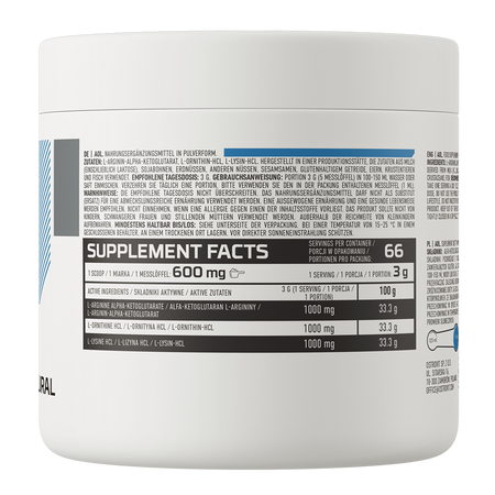 - Źródło trzech wartościowych związków - jedna porcja suplementu diety dostarcza do organizmu 1000 mg A-AKG, 1000 mg L-orintyny HCl oraz 1000 mg L-lizyny HCl.